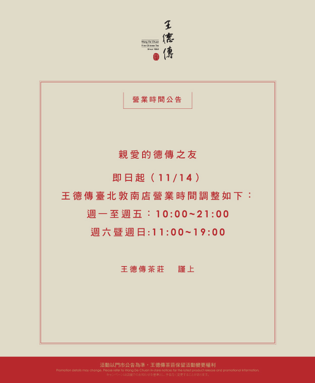 11/14起,王德傳臺北敦南店營業時間調整公告