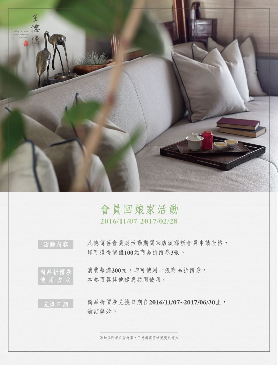 【德傳十五載,有您相伴,真好!德傳會員回娘家活動,真誠邀約】 | 活動時間 | 2016/11/07-2017/02/28 | 活動內容 | 凡德傳舊會員於活動期間來店填寫新會員申請表格,即可獲得價值100元商品折價券3張。 | 商品折價券使用方式 | 消費每滿200元,即可使用一張商品折價券,本券可與其他優惠共同使用。 | 兌換日期 | 商品折價券兌換日期自2016/11/07~2017/06/30止,逾期無效。